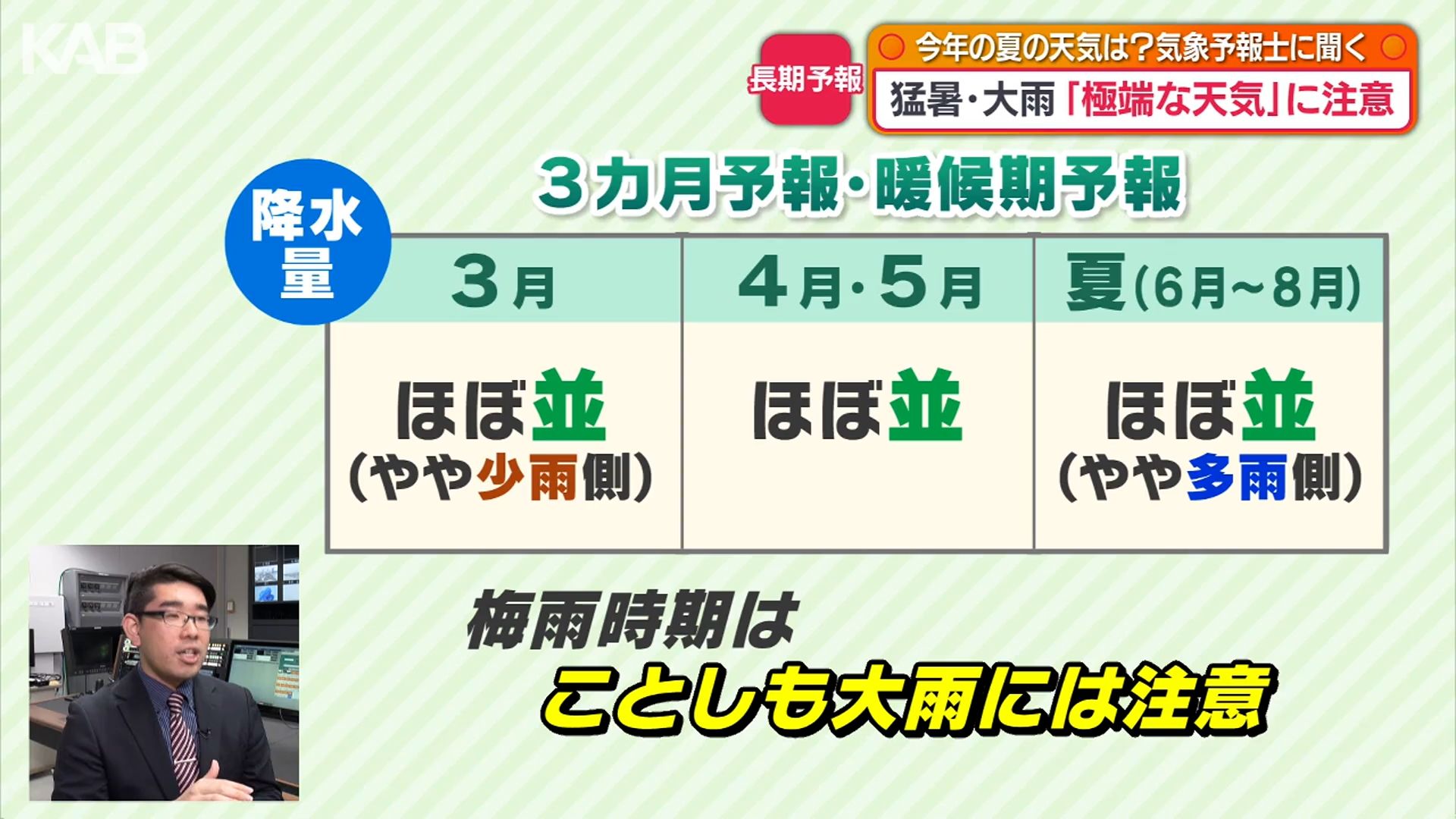 「3月は少雨傾向、4月以降は平年並み、梅雨時期はやや多雨傾向で雨が多いと予想されています。こういった時に梅雨前線が停滞したりすると大雨になる危険性、恐れがある」