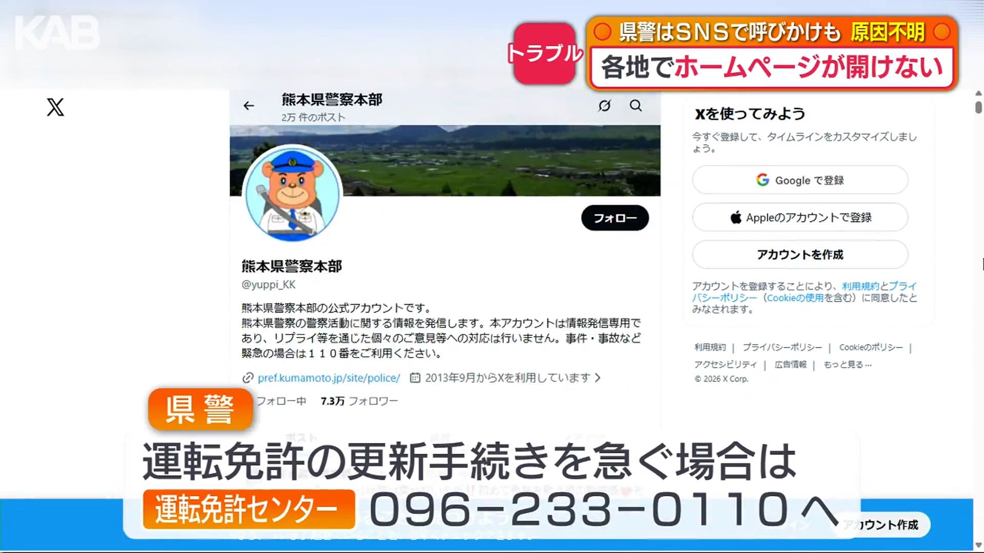 影響は熊本県警ホームページにも。運転免許手続きのweb予約に関するページも開くことはできず、県警は、公式SNSで免許手続きを急ぐ場合は運転免許センターに電話するように呼び掛けています。