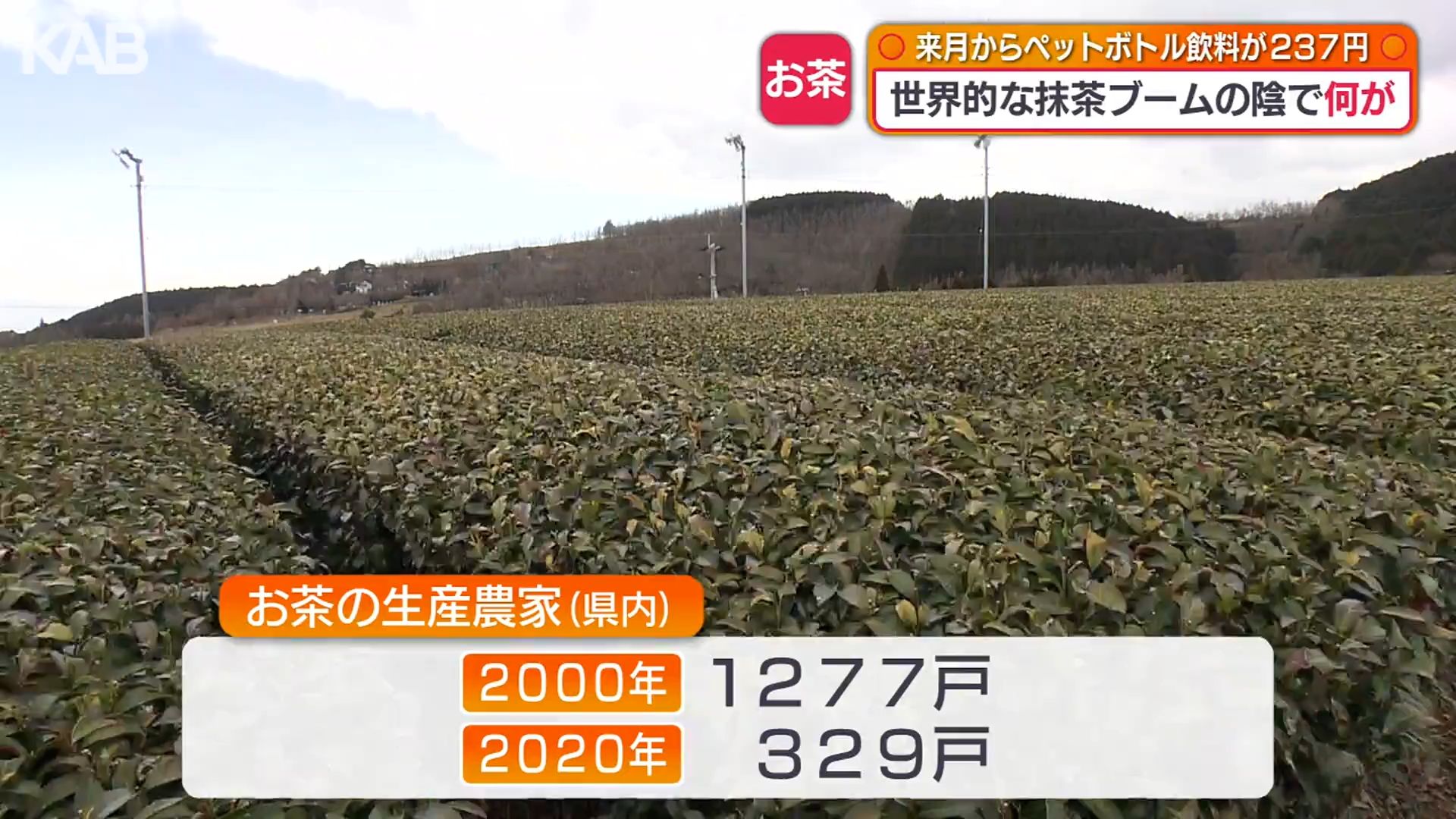 生産農家も減少傾向。農林水産省によると、2000年には1000戸を超えていた熊本県内の生産者は、2020年で329戸まで減少し、栽培面積も縮小が続いています。これらの影響が重なり、茶葉の不足が価格高騰の一因となっています。