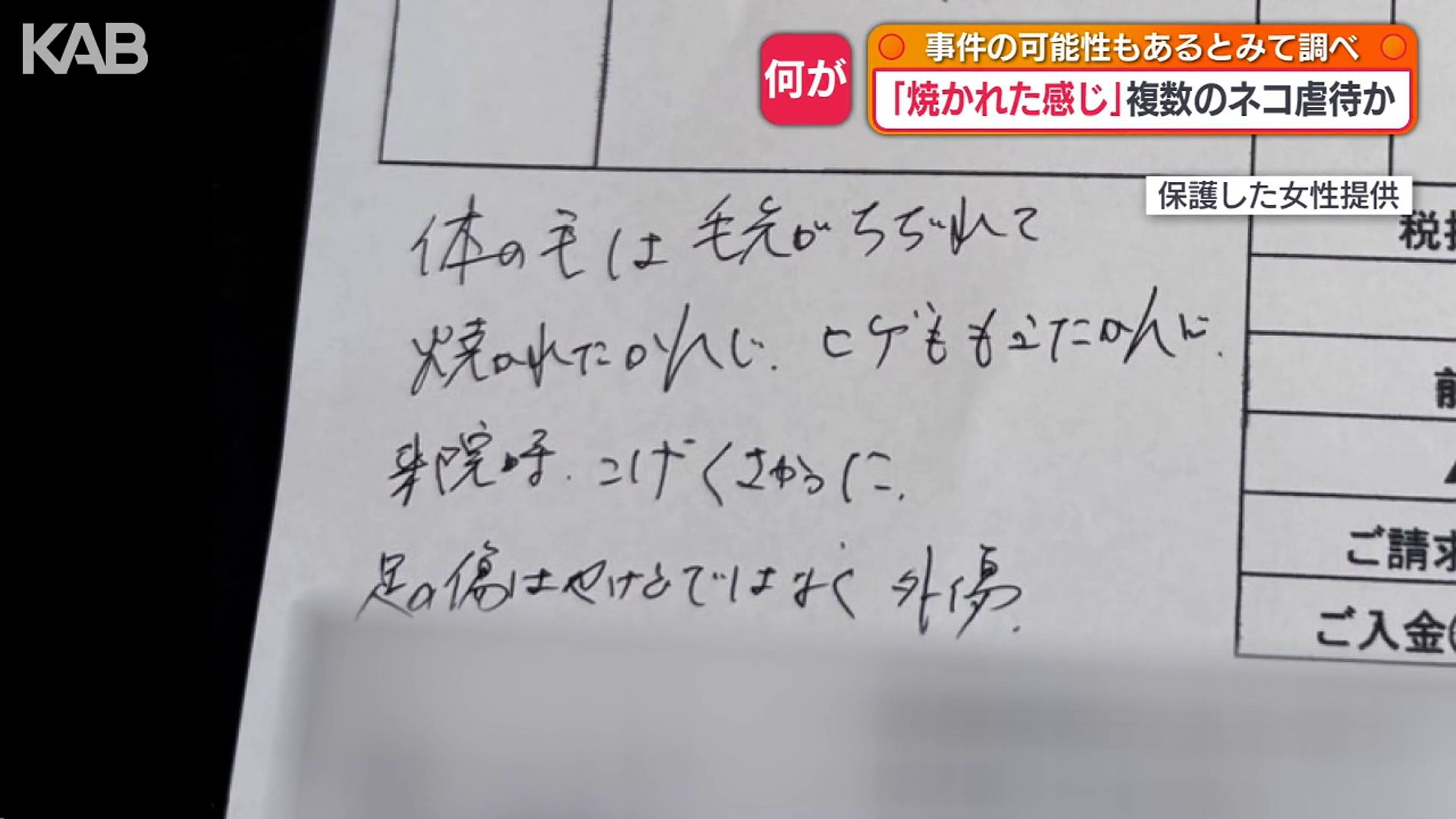 保護の後に受診した動物病院のメモには「毛先が縮れて焼かれた感じ、ひげも燃えた感じ、来院時焦げ臭かった」と書かれています。