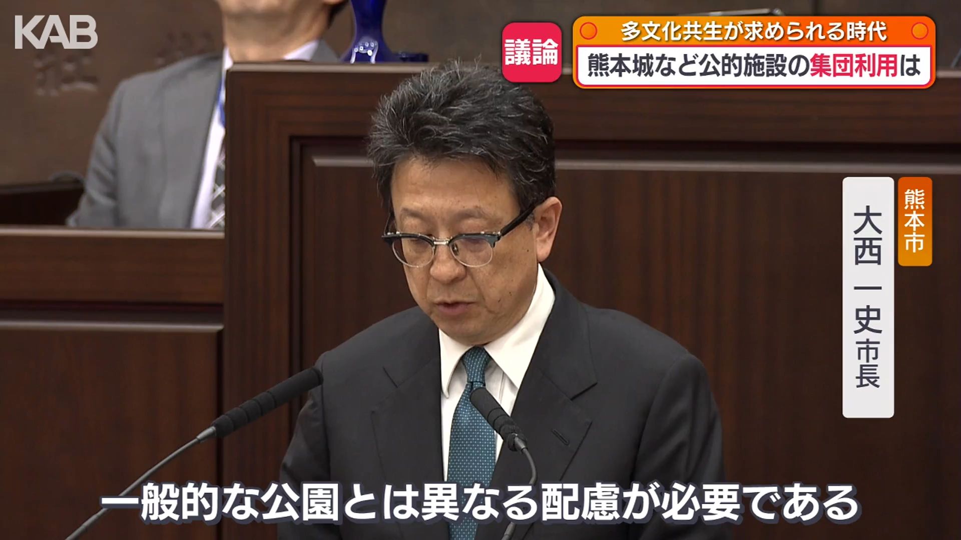 熊本市内の公園での大規模な集団利用の運用などについて質された大西市長は「熊本城などの熊本市を象徴する歴史的・文化的価値を持つ公園は、一般的な公園とは異なる配慮が必要であり、都市公園における大規模な集団利用については、周辺利用者への影響や、空間の占用状況、公園の特性などを踏まえた判断基準のあり方や、適切な運用について慎重に検討してまいります」としました。