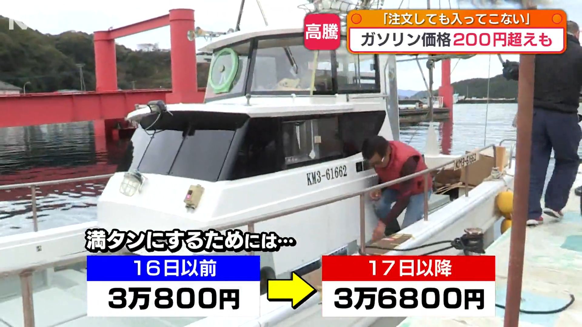 200リットルくらい入るという船。16日以前と比べると、満タンにするためにかかる費用は6000円も値上がりした計算です。