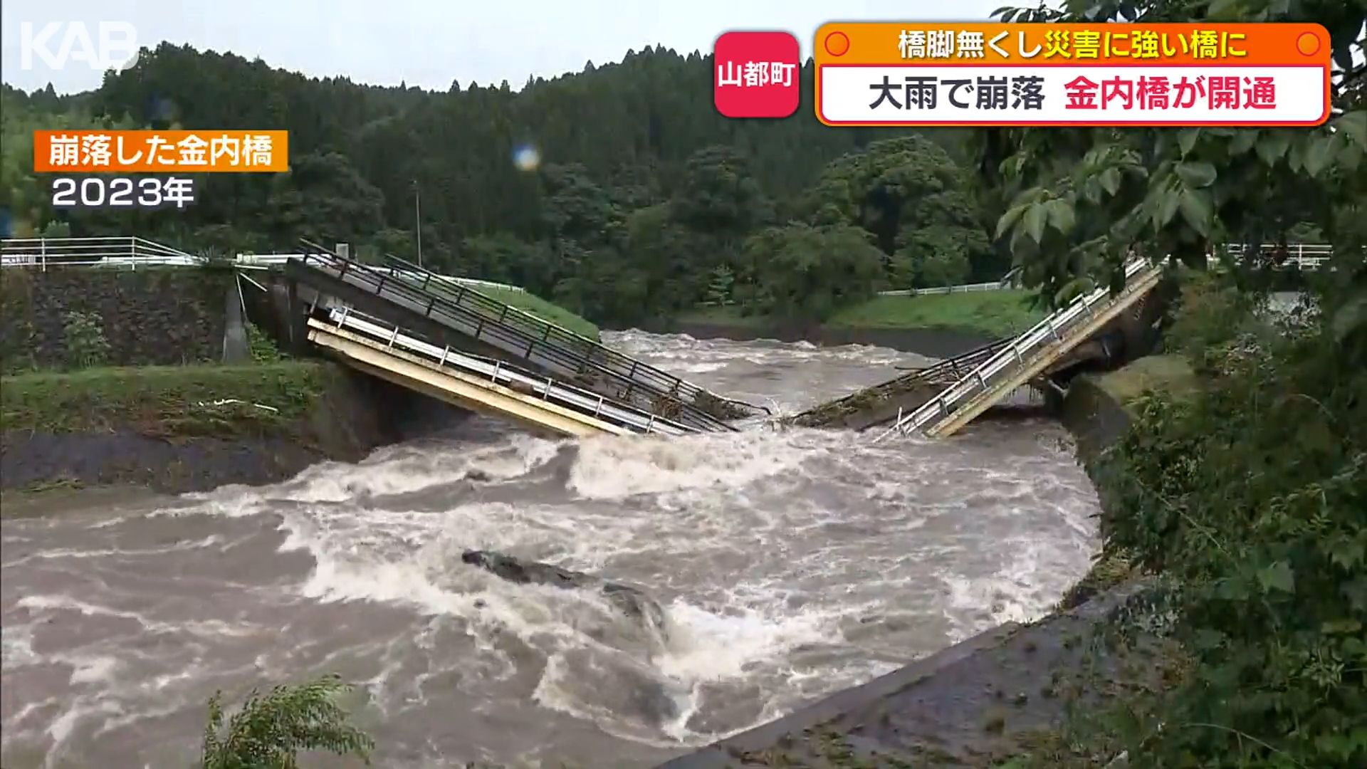国道445号の金内橋は、線状降水帯が2回発生した2023年7月の大雨で、橋の中央部分から折れるようにして崩落。仮橋での通行が続いていました。