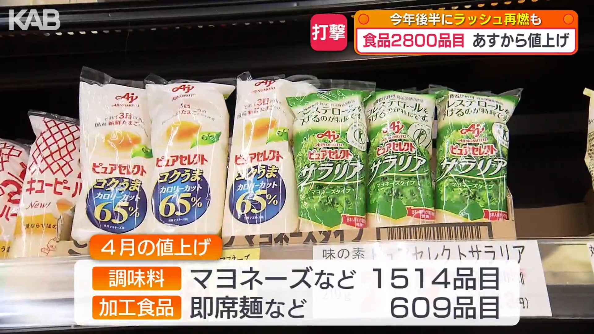 最も多いのは、マヨネーズやドレッシングなどの「調味料」で1514品目、次いで即席麺などの「加工食品」が609品目。「原材料」では食用油が目立ちます。