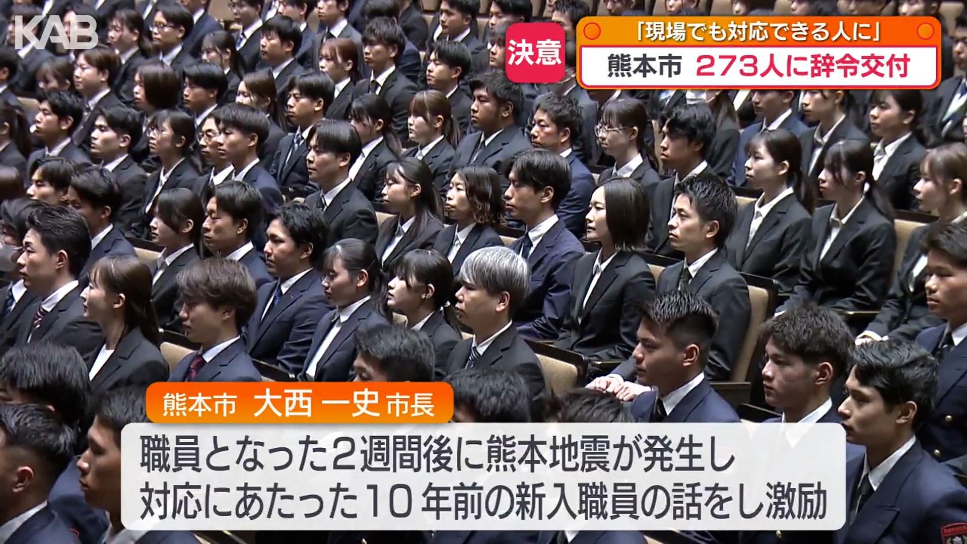 熊本市では273人を採用。大西一史市長が、職員となった2週間後に熊本地震が発生し対応にあたった10年前の新入職員たちの話をし、激励しました。
