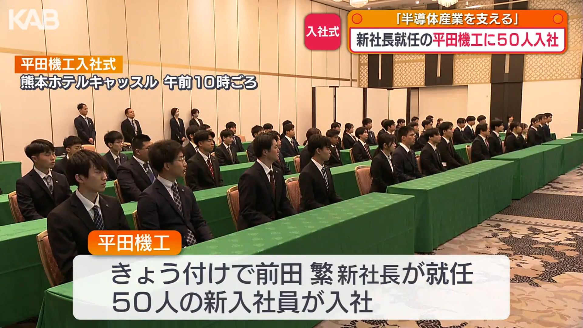 平田機工がメインスポンサーを務めるロアッソ熊本から上村周平選手が「やる気に満ちた状態の継続は難しいので、習慣化を大事にしてほしい」と激励のメッセージを送り、新入社員を代表して、高橋聡規さんが「半導体産業の発展が著しい熊本で、同期50人と切磋琢磨しながら会社に貢献したい」と決意を語りました。