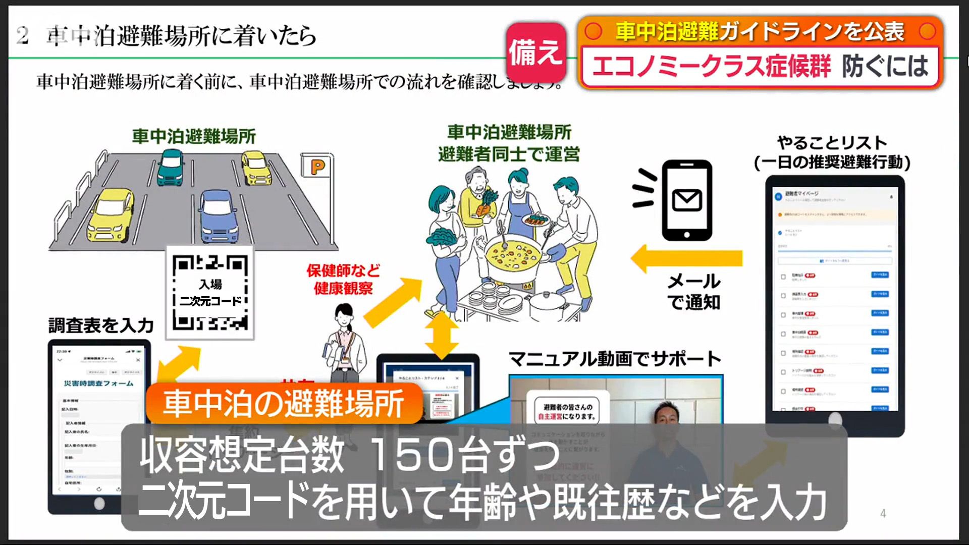それぞれの収容想定台数は150台で、二次元コードを活用し、年齢や住所、既往歴などからエコノミークラス症候群のリスクを選別、保健師が巡回して健康観察などをします。