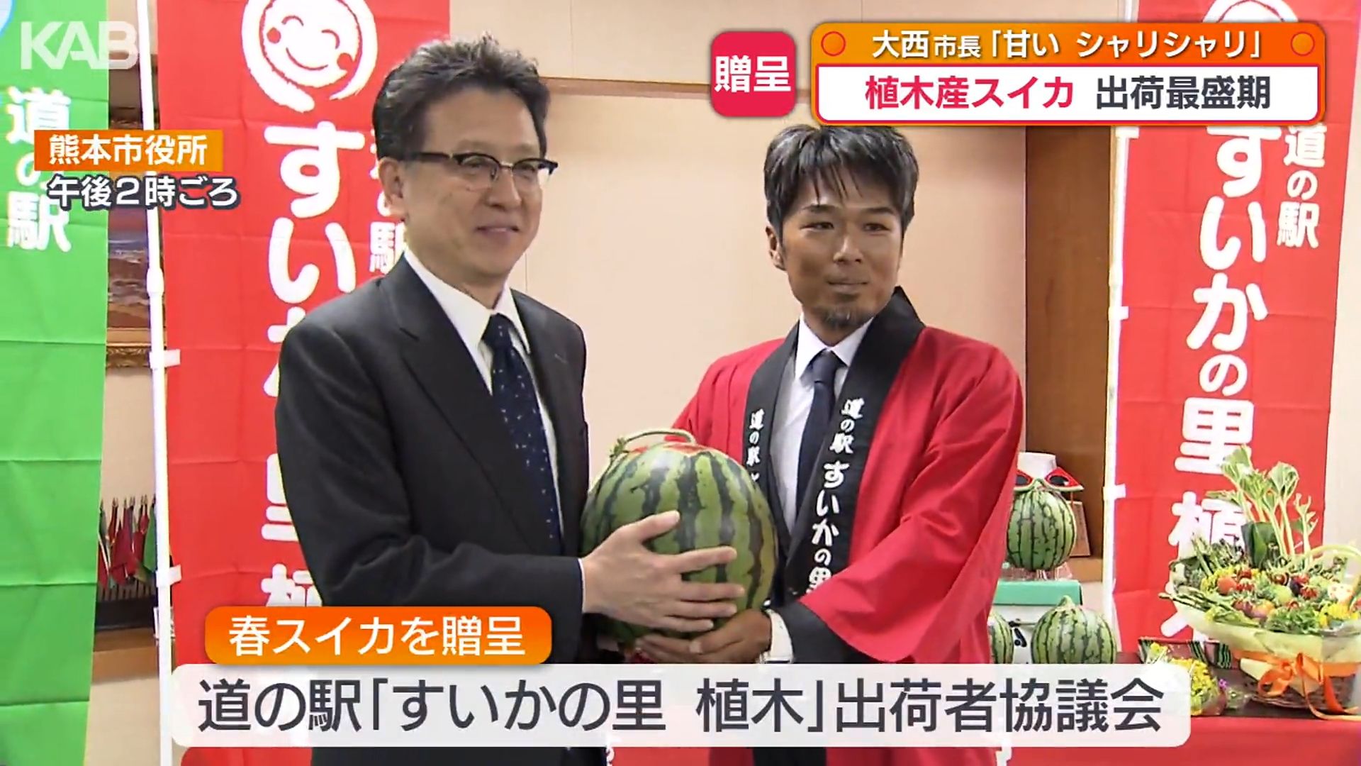 大西市長にスイカを贈ったのは、熊本市北区植木町にある道の駅「すいかの里植木」の出荷者協議会です。