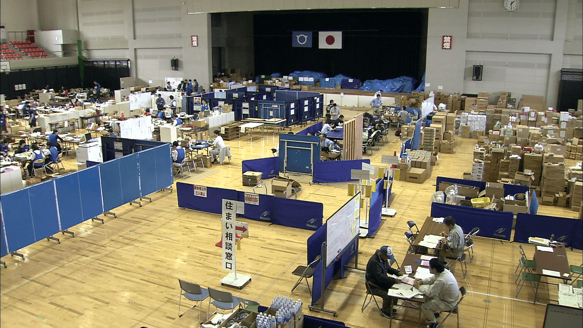 市民体育館に対策本部を移し、5月10日に体育館で市役所の業務を再開。パソコン4台のみでプリンターもなく、卓球台をデスク代わりに、罹災証明の案内などは段ボールにマジックで書いて対応しました。