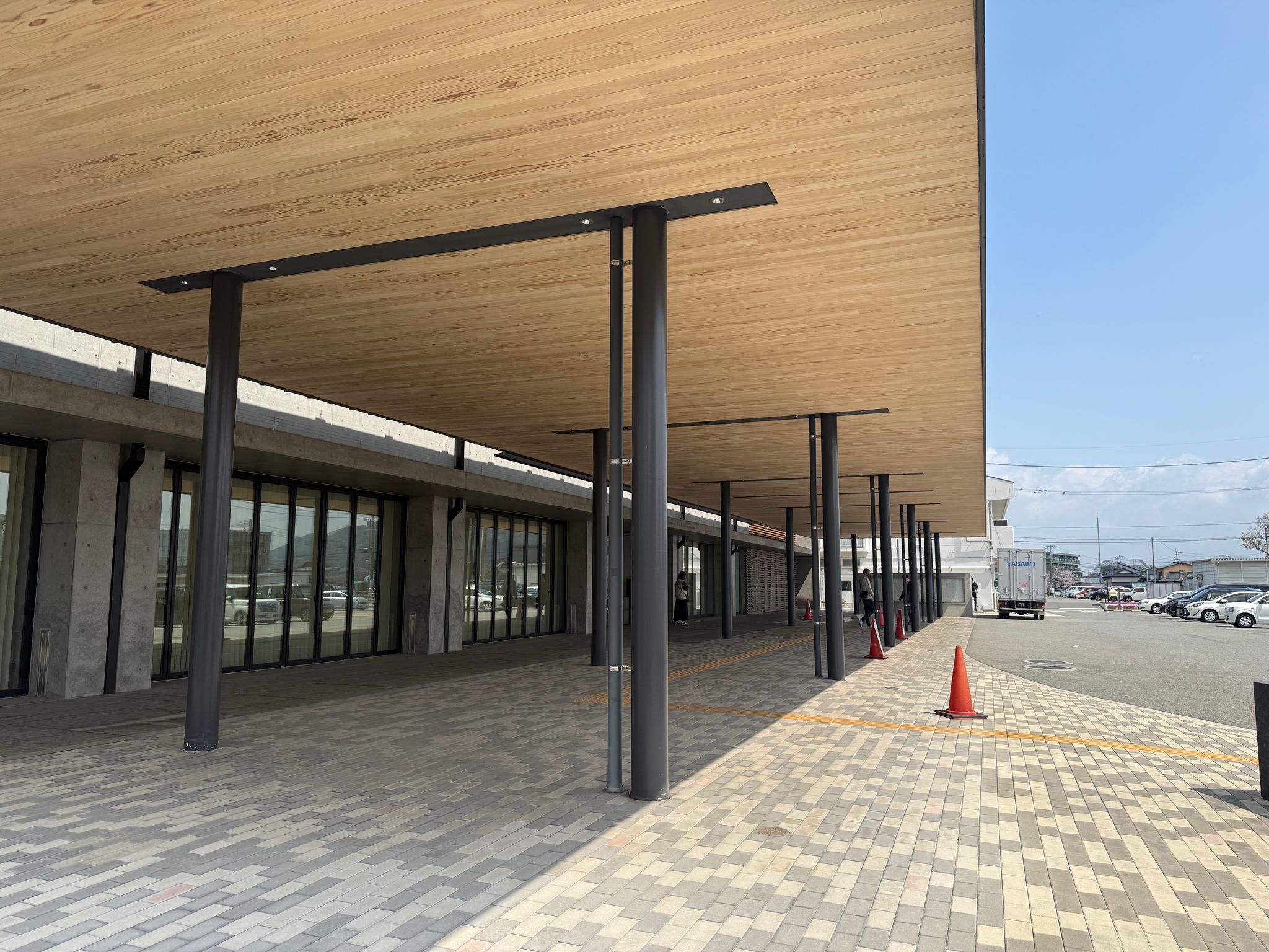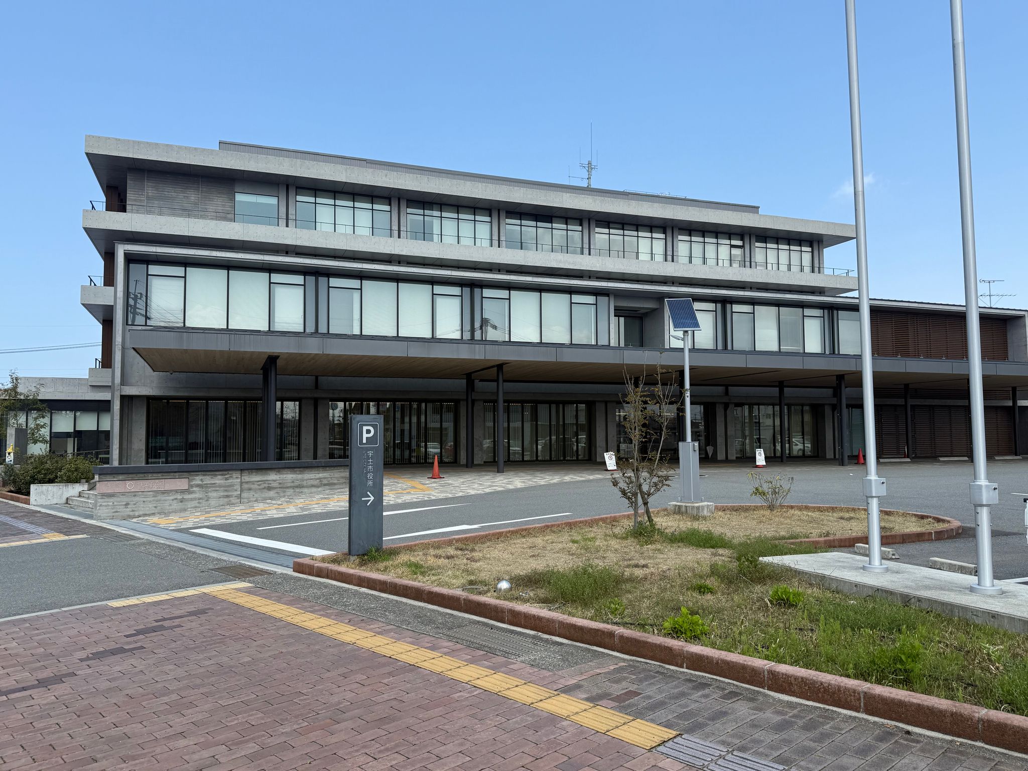 宇土市の新庁舎は、地震から7年後の2023年に完成。免震構造の4階建てで、正面玄関の大きなひさしが特徴的です。