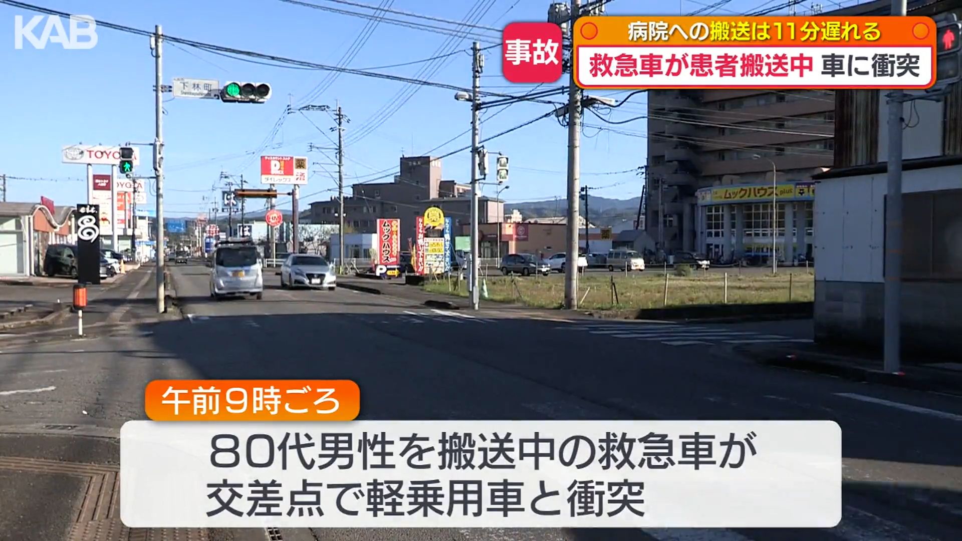 消防によりますと、午前9時ごろ、80代の男性を搬送中の救急車が、交差点で軽乗用車と衝突。軽乗用車は、衝突のはずみで右折待ちで停車していた別の軽乗用車にも衝突しました。