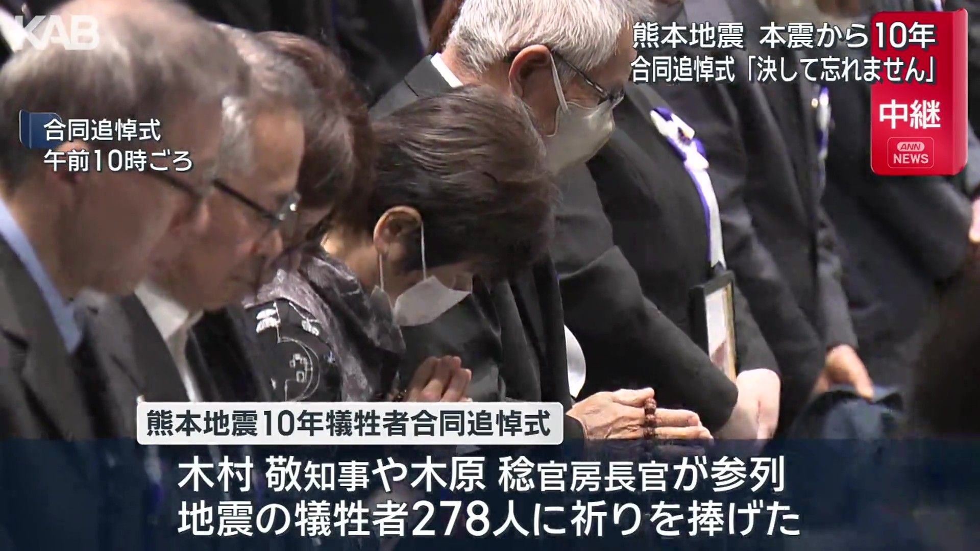 熊本市の熊本城ホールでは、午前10時から追悼式が行われました。遺族をはじめ、木村知事や木原官房長官も参列し、犠牲となった278人に祈りを捧げました。