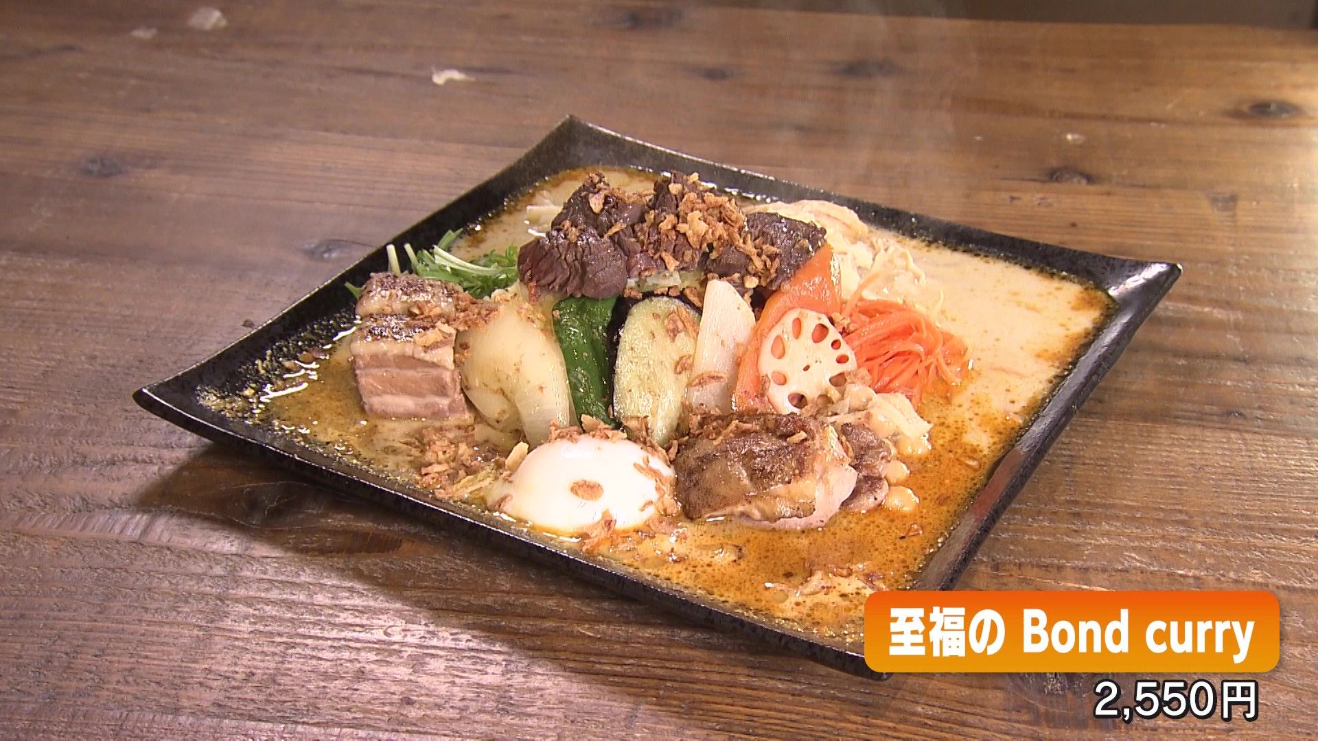 イチオシのメニューは、「至福のBond curry」です。牛ステーキ、豚の角煮、チキングリル、そして6種類の野菜をトッピングしたボリューム満点の一皿。ご飯は雑穀米とターメリックライスのハーフ&ハーフ、カレーはグリーンカレーとオリジナルカレーの合いがけ、辛さはメープルシロップとチリペッパーで自由に調節できます。
