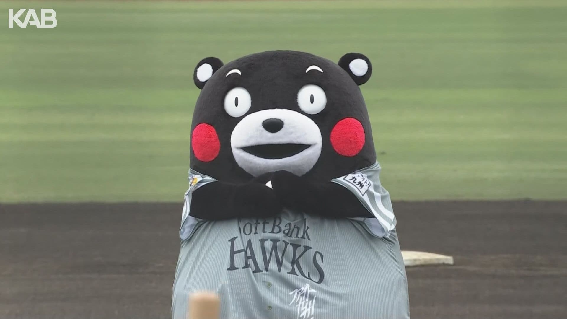 熊本市のリブワーク藤崎台球場で25日午後1時から行われている福岡ソフトバンクホークスと千葉ロッテマリーンズの公式戦で、始球式にくまモンが登場しました。