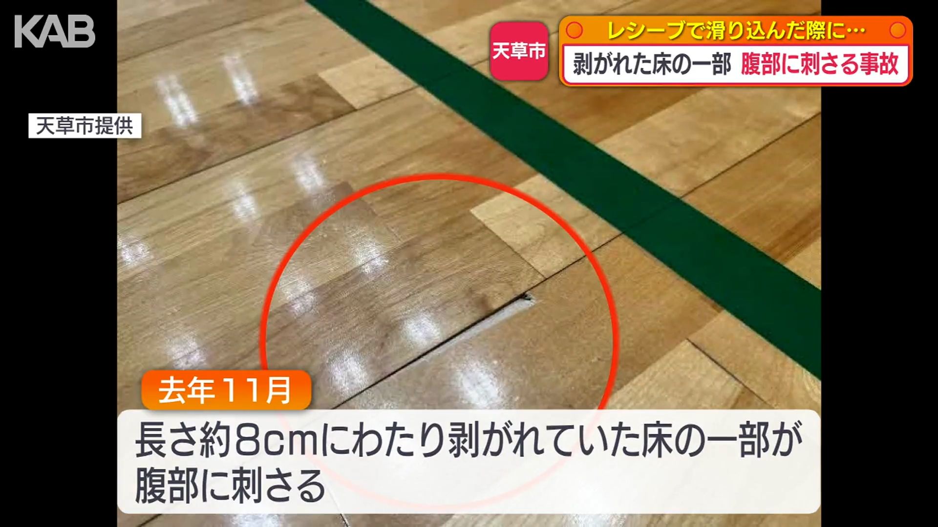 天草市によると、去年11月、天草市民センター体育館で開催されたミニバレーボール大会の試合中、参加していた宇城市の20代の女性がレシーブのため床に滑り込んだ際、およそ8センチにわたり剥がれていた床の一部が腹部に刺さったということです。