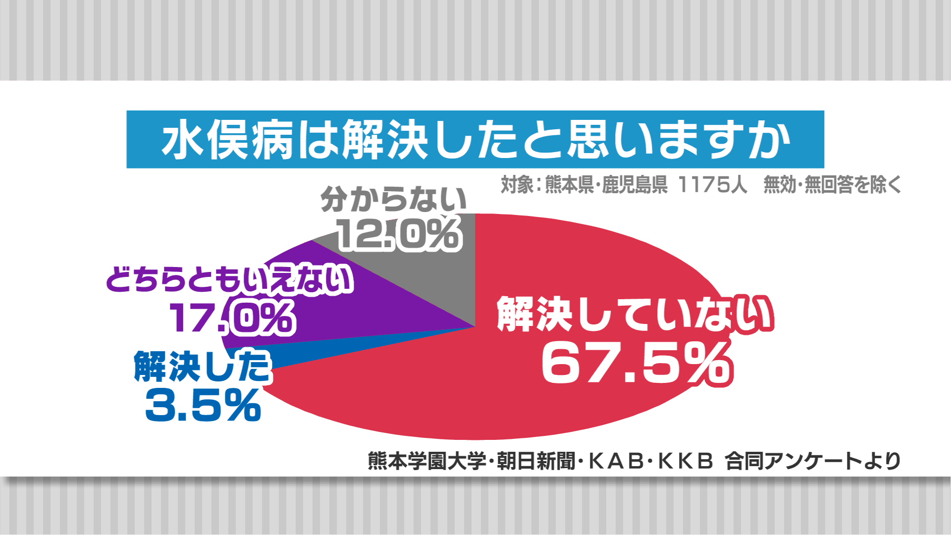 「水俣病は解決したと思いますか?」という問いに対しては、「解決した」3.5%にとどまり、「解決していない」が67.5%にのぼりました。
