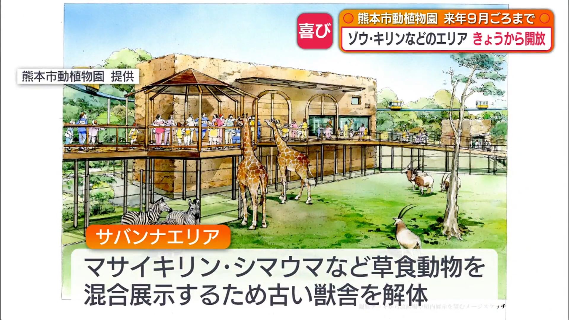 古い獣舎を取り壊してスペースを確保し、マサイキリンやシマウマなどの草食動物を混合展示します。さらに、水堀を設けて、対岸にはライオンも飼育し、アフリカの雄大な大地のように、様々な動物が共生する環境を演出する計画です。