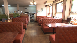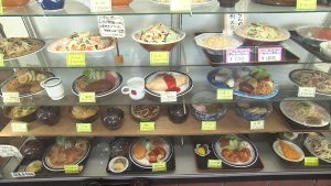1949年(昭和24年)創業の食堂。昭和の洋食屋さんといった雰囲気で、ショーケースには食品サンプルが並び、BGMには昭和の名曲が流れています。